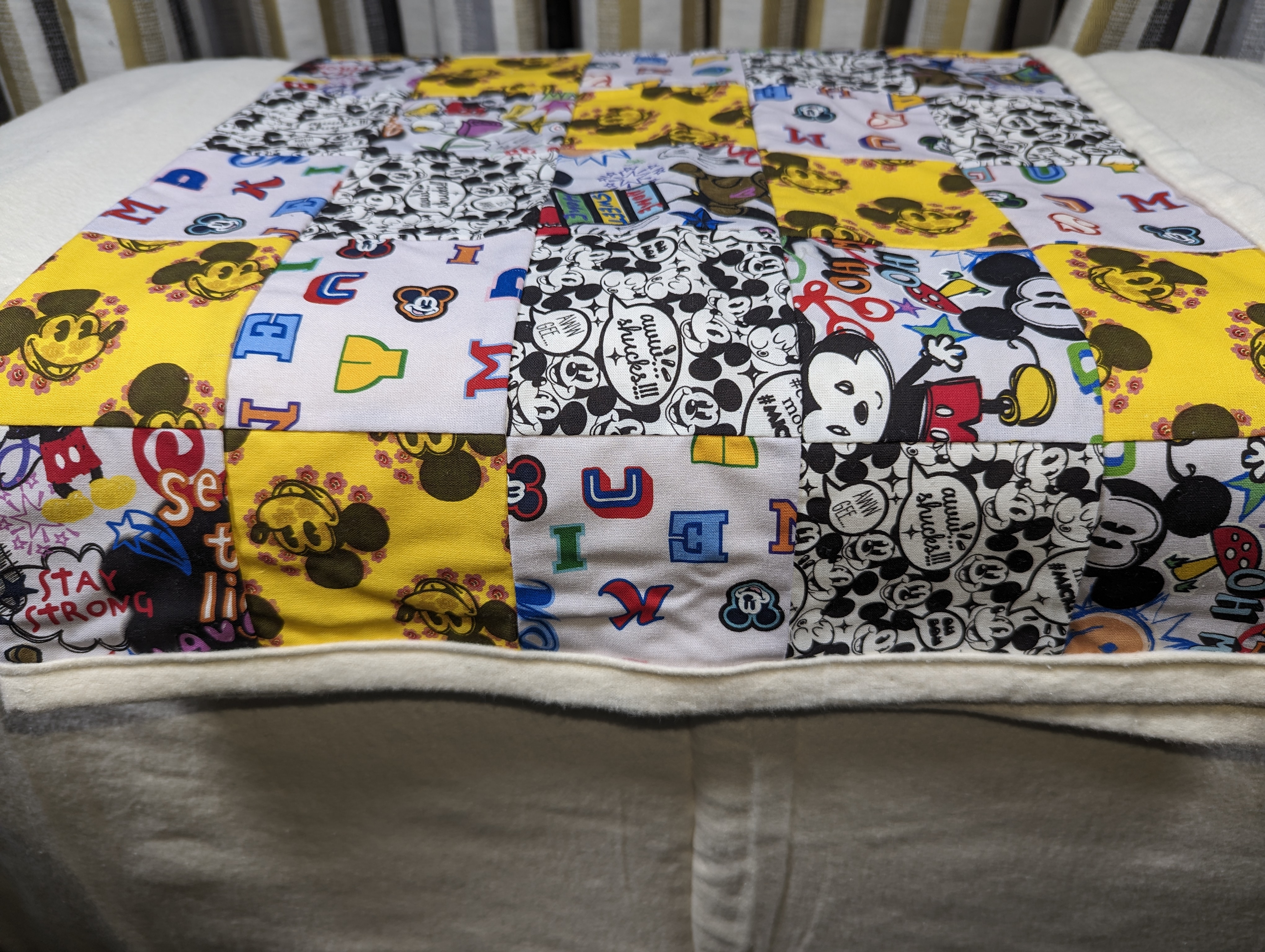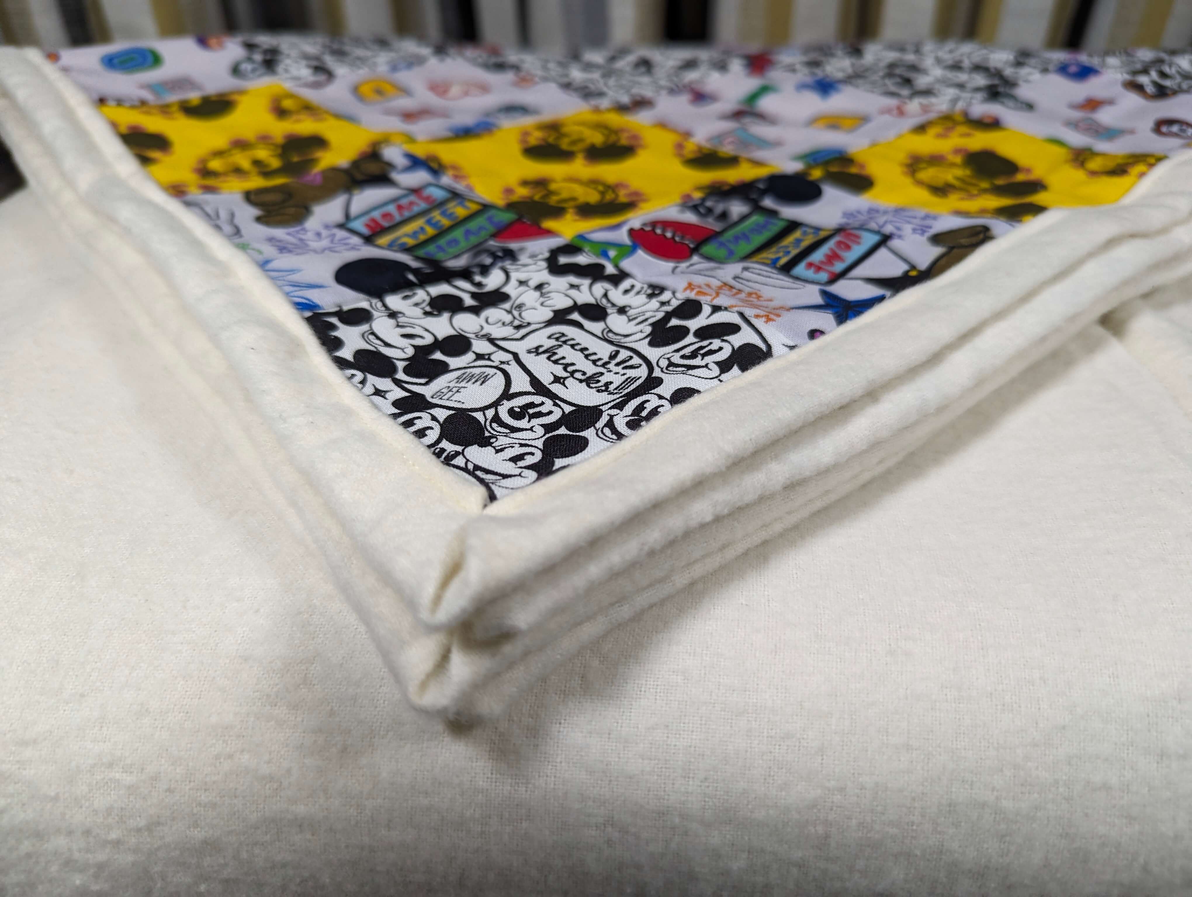 Introducing our cozy Mickey Mouse Patchwork Blanket, specially designed for your little one's comfort and joy. Crafted from 100% cotton with a brushed backing, it offers softness and warmth while showcasing beloved Mickey Mouse motifs in a charming patchwork design, perfect for cuddling and nap time adventures. Bring the magic of Disney to your child's nursery with this delightful and cuddly blanket.
